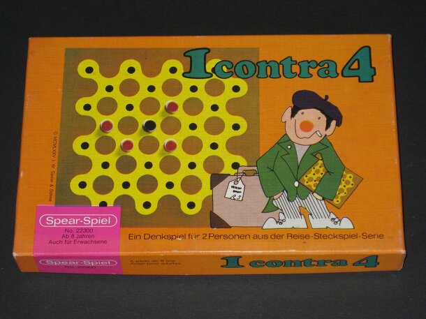 Two games in one small box: „4 gegen 4“ is an old Chinese Checkers variant, which is played on a small 4x8 board . The 4 playing pieces per player are not allowed to move backwards. Winner is the player whose playing pieces occupy the opposing starting position first. „4 gegen 1“ is a Fox and Geese variant, where 4 pieces try to surround the single piece...