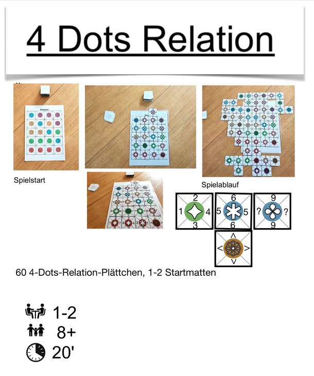 4 Get It is a domino style board game where you try to build squares of the same color - or squares that are composed of all four distinct colors. Each square is claimed by placing a token onto it. Each tile shows two colors (some tiles are, of course, doubles) and two symbols. When laying down a tile it's color must only match only match the color of one...