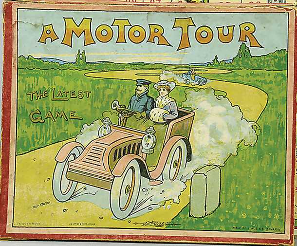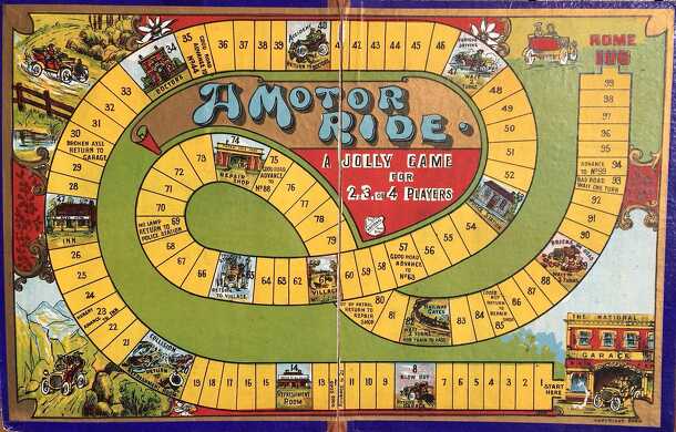 This roll-and-move game features a winding yellow track on top of a green (grassy) background. It's "a jolly game for 2, 3, or 4 players." From the Powerhouse Museum "The game is significant because it uses scenarios familiar to Australian country motorists during the first half of the twentieth century, when Australian roads were largely poor, gravel...