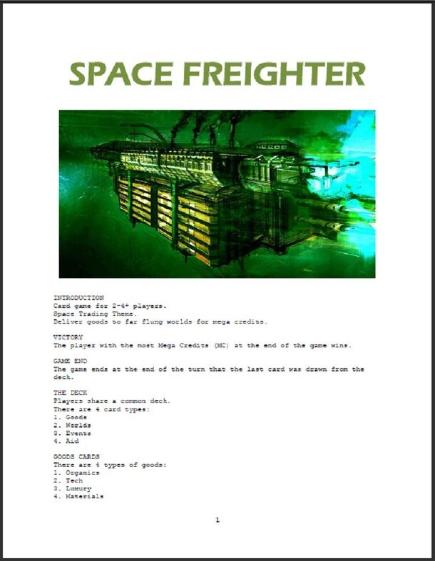 "Card game for 2-4+ players. Space Trading Theme. Deliver goods to far flung worlds for mega credits." The players share a common deck made up of four types of cards: Goods, Worlds, Events, and Aid. Mega Credits are earned by delivering Goods to Worlds. This is done by one World card and one or more Goods cards. Event cards are resolved immediately when...