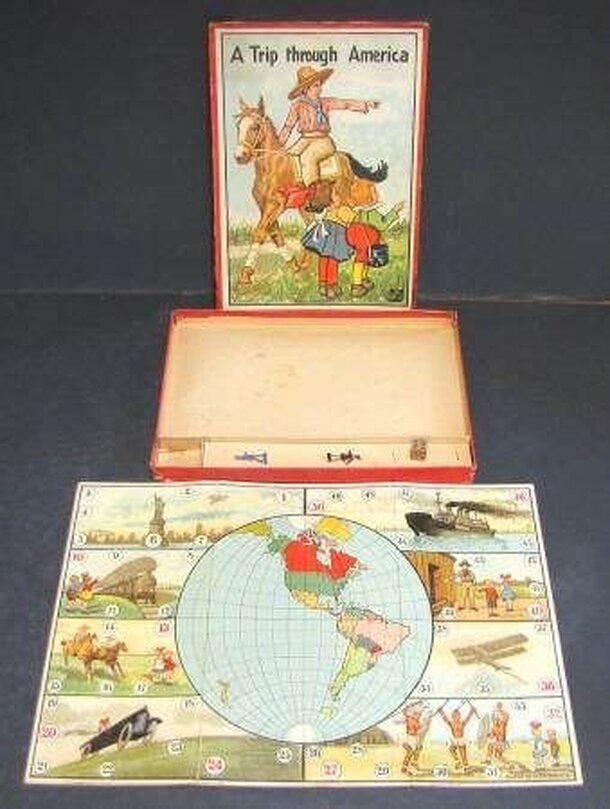 A roll-and-move race game involving a train trip from New York to San Francisco. Pre-dates World War I. The spaces are marked with various symbols representing penalties and bonuses. Phoebe Snow was an advertising figure for the Lackawanna Railroad running from New York to Buffalo. The rail line advertised cleaner burning coal which helped Miss Snow's...