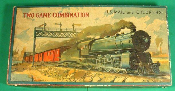 Vintage (date unknown) board game where players spin and move along a pre-determined route on a map of North America. "The object of the game is to see which player can deliver Uncle Sam's mail the quickest and best." This game comes in a cardboard box about 17" x 9" with a great graphic of a speeding steam engine pulled train on the lid. In the lower left...