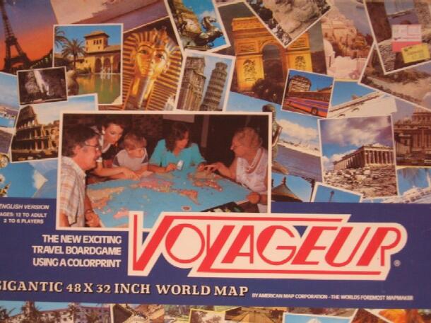 Voyageur is a global travel game that serves well as an educational game (though the geography is now 20 years out of date and counting) but is light enough to be playable even by those not in want of a geography tutorial. It is played on an 8-segment 32"x48" map of the world, which is mounted on a thick cardstock attached to half-inch-thick foam backing....