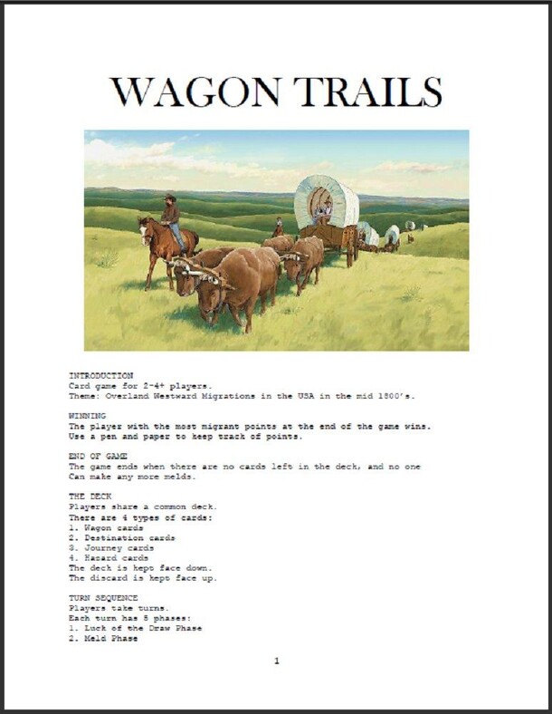 "Card game for 2-4+ players. Theme: Overland Westward Migrations in the USA in the mid 1800’s." The game is played using a custom deck consisting of four types of cards: Hazard Cards, Wagon Cards, Destination Cards, and Journey Cards. Each Destination and Wagon Card has a Migrant Point value. The players are trying to play melds consisting of a Destination...