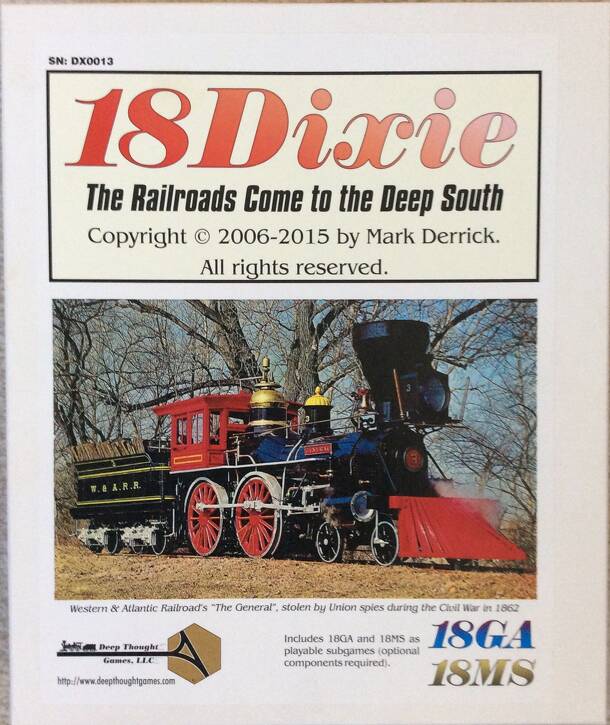 18Dixie is an 18xx game set in the Southeast region of the United States. Players invest in railroad companies in an effort to have the greatest net worth at the end of the game. This is determined by adding the cash holdings of the players to the value of the stocks each owns. The money in the actual companies, though, are separate from the individual...