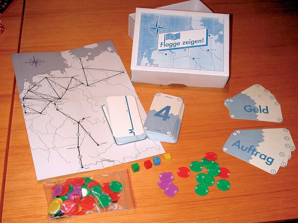 (from the rules) Contents: =96 playing cards 55 money chips 5 black (worth 50) 20 green (worth 10) 5 yellow (worth 5) 25 red (worth 1) 10 action chips (square) 4 wooden cubes (ships) Board Summary: Each player gets a ship and tries to fulfill as many freight contracts as possible to have the most money at the end of the game. This was a promotional game...