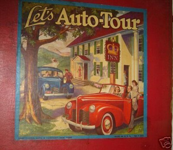 A "travel game" in which up to four players travel on different routes from a joint starting point on the west coast of the United States to four different destinations on the east coast. The game features a 34x17" hinged mapboard showing the lower 48 United States, four stand-up automobile pawns, two spinners, and play money. The instructions are printed...