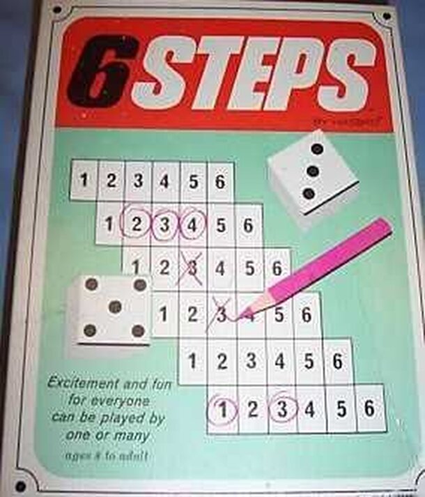 Contents include: two pencils, two standard dice, one shaker cup, and a pad of score sheets. The score sheet has a staggered (steps) grid of six rows with the numbers one through 6. The players take turns rolling the dice, and if available, circle a number on their score sheet. For example, if a player rolls a three and a six, they can circle the number 6...