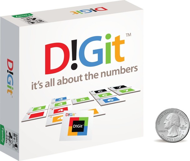 D!Git is a number and color based tiling game. There are 50 number/color tiles (0-9 in each of 5 different colors), 5 color specific Wild tiles, and 5 D!Git tiles (can represent any number in any color). Each player draws one random tile. High number goes first. All tiles are then jumbled and distributed evenly and stacked face down in front of each...
