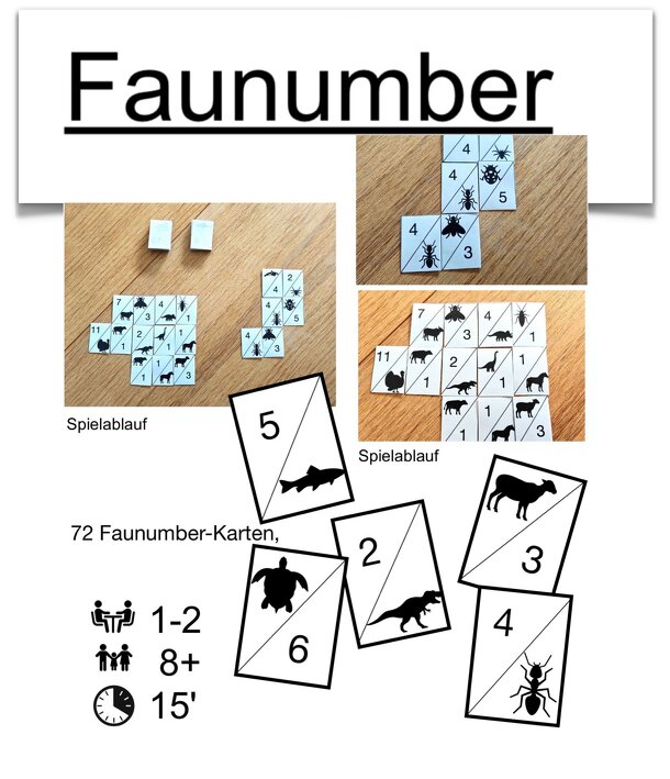 A tricky game for in between or on the go with high replay value, new game mechanics, driven by 72 “Faunumber“ cards. You have play/lay out one cards after the other to build diagonal lines to create value of line of the same category of animals or numbers or streets of numbers. The winner is the player with the highest points at the end of the game. The...