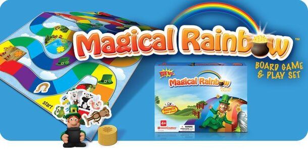 From the publisher's and Toy Directory websites: The board is used on a slight incline and the game pieces are magnetic. The Magical Rainbow is a magnetized game that takes children on a special adventure through 7 magical lands. Players race to a pot of gold, watching out for Paddy the Leprechaun, who on every turn travels from land to land protecting his...