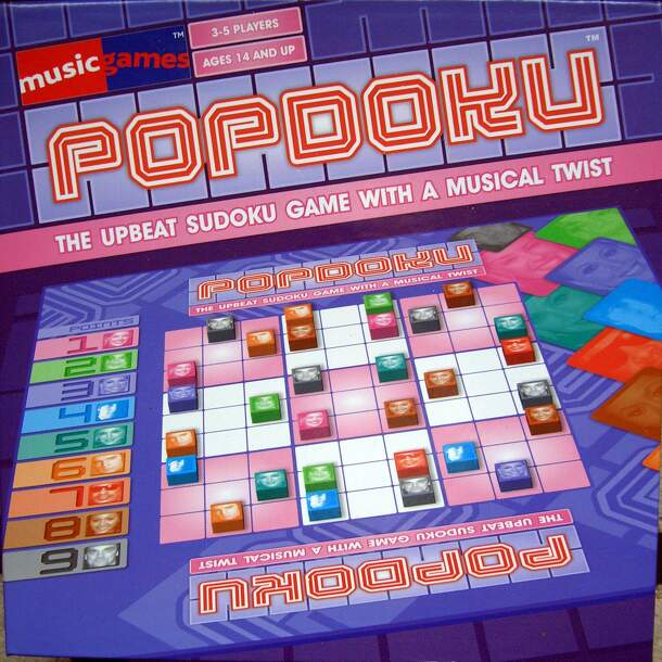 Popdoku is played on a 9 by 9 Sudoku style board using 9 sets of 9 tiles each tile in a set has the same colour and number on it but each set is a different colour and number (1 to 9)from the others. The rest of the components consist of 4 tile racks, a timer, a tile bag, a score pad and pencil and a rule book. The rule book contains a number finished...