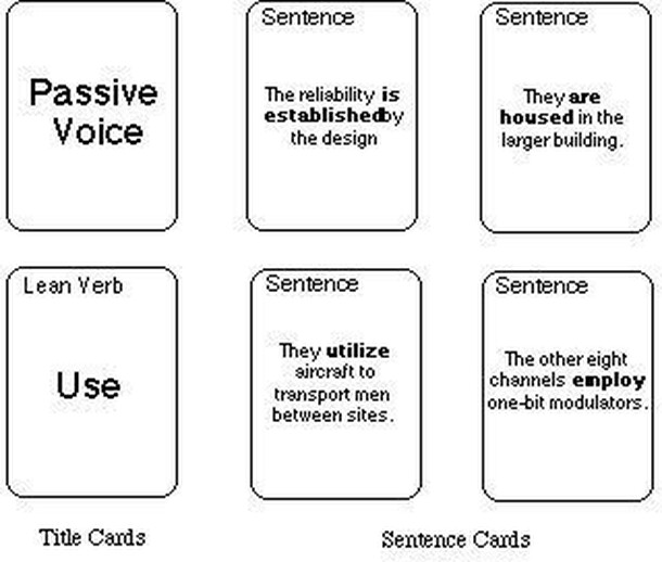 The learners will be able to identify and differentiate between active and passive verbs and replace heavy verbs with lean verbs. For example, the learner would replace the verbs, "utilize" or "employ," with the verb, "use." "Utilize" and "employ" are heavy verbs and "use" is a lean verb. Gameplay is similar to Rummy. The first person to acquire all sets...