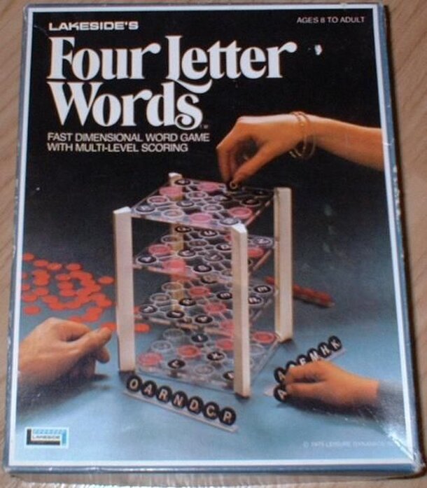An amalgam of Scattergories and Spoons. Players are given four cards, and must pass one and draw one until someone has a four-letter word that fits the category drawn at the beginning of the round. When someone grabs a beanbag signaling he or she has a word, everyone grabs for one. When someone is caught six times without a bag, the game ends, and whomever...