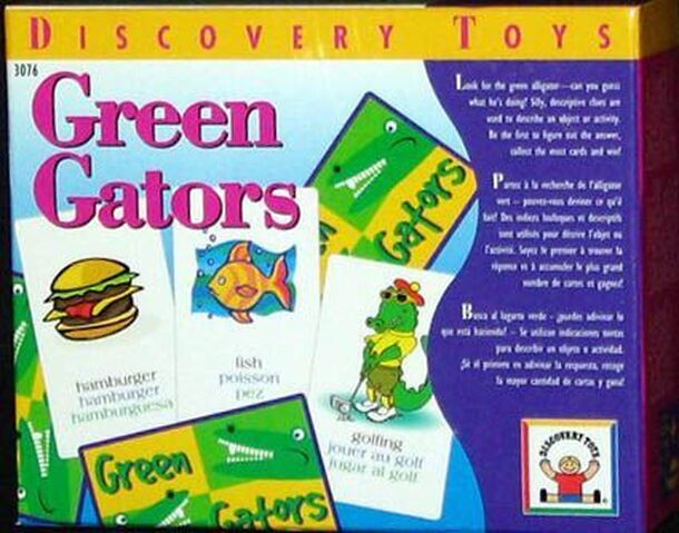 The Giggly-Silly bilingual descriptive word game! No reading required! Pictures are identified to encourage early readers of both English and Spanish!Green Alligators is that wonderful little "I'm thinking of" kind of card game, but this one has pictures so you can't change your mind part way through the game! Play with your little one while doing other...