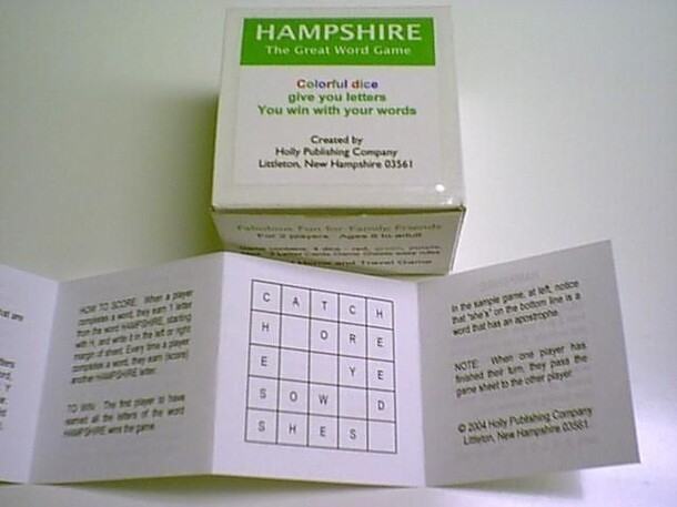 Hampshire is a word game made in Littleton, New Hampshire (USA) - hence the name. The game comes with four dice (red, blue, green, purple), two player letter charts (in color), rules, and a pad of score sheets (which contain simply 25 blank squares in a 5x5 grid). The whole thing fits in a box 3" x 3" x 2" (7.5 cm x 7.5 cm x 5 cm) and so is touted as being...