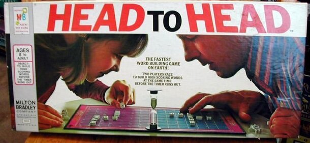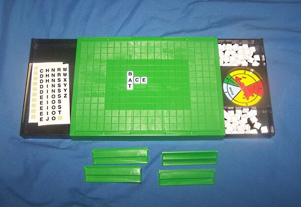 A simple letter-tile-placement game. Words can be formed diagonally as well as horizontally or vertically. A spinner is used to determine where the next word must go: either at the beginning, middle or end of an existing word, or "any" (anywhere on the board). The penalty for not being able to put down a word is to pick up 1-4 more tiles (as indicated in...