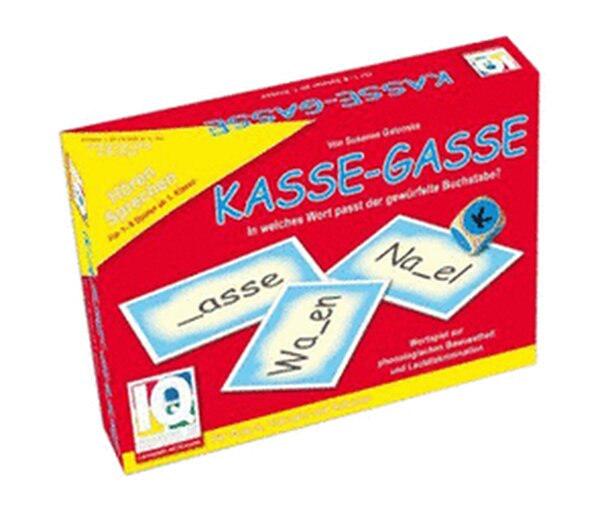 Kasse-Gasse is played with a deck of 36 cards and a die. Each card shows a word from which one letter is missing. The die shows six letters: b, d, g, k, p and t (the 'plosives'). At the start of the game, the cards are shuffled, and eight cards are drawn and placed on the table, face-up. Then, the die is rolled. All players now search for a word on one of...