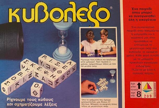 A word game with a timer. Players roll 20 dice with letters and according values on them, in order to form words with the highest values. Ένα παιχνίδι ευστροφίας, αντίληψης και… ταχύτητας! Άδειασε τα 20 κυβάκια με τα γράμματα στο τραπέζι, γύρισε την κλεψύδρα και γρήγορα, πριν τελειώσει ο χρόνος, σχημάτισε όσες πιο πολλές ελληνικές λέξεις μπορείς! Σημείωσε...