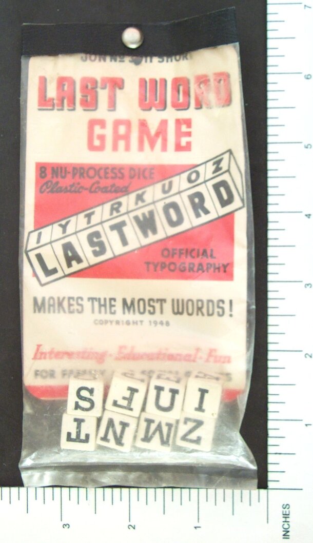 Last Word was published in A Gamut of Games, a word by Sid Sackson "Last Word was born one day when I was stranded with two word-game lovers far from any letter cards, letter dice, or letter tiles. Challenged, I devised a game using only an available pencil and some sheets of paper. I was rather surprised when it gained a considerable measure of popularity...
