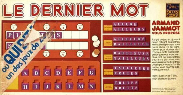 Based on a French tv show from the 1970's. The game consists of 82 tokens, each one marked with a letter and a wooden board with two rows with 10 squares (in each square a token fits). Each round a player forms two words (one on each row) ranging from 4 to 5 letters. Then the players take turns to modify the words (changing or to make it longer by adding...
