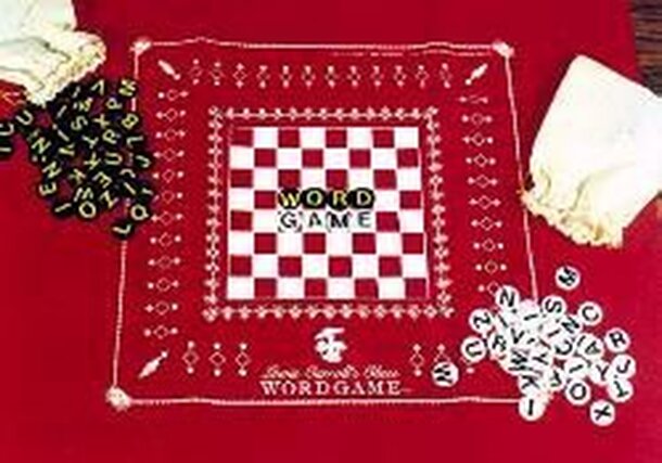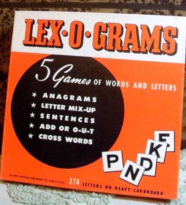 Subtitled with: "5 Games of Words and Letters" CONTENTS: The square 'box' that is ONE-inch deep by 7-inches along each side; 374 letters; and "Instructions" sheet. The 5 Games, as detailed from the "Instructions", consist of the following: "Anagrams": for 2 to 6 Players with the LETTERS face down, or unseen, when chosen from the pile and used to form...