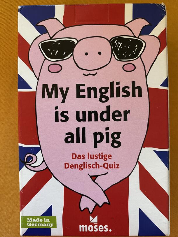 "My English is under all pig" is a card game about common phrases. If you translate German idioms into the English language you don't get the correct English equivalent, but rather a funny English sentence. Then it's not English, it's Denglish ("D" for Deutsch = German). So one by one the players draw a card and have to translate the Denglish sentences...