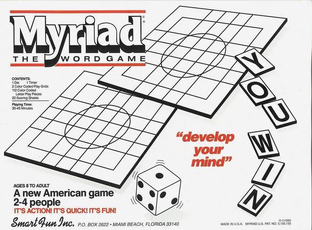 In Myriad, each player has a board and a set of letter chips. The chips are placed on the boards to form words, with the score per letter being the number of letters in the word. Unusual features of the game include: After playing a word to their own board, a player may place their letters on other players' boards to form words. Each player with letters in...