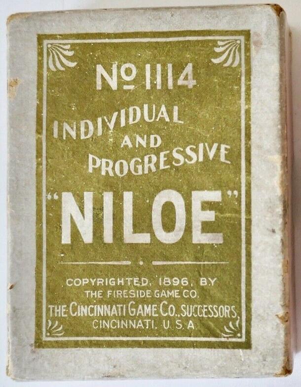 Crossword dice game. 13 cubes with one letter on each face, except one blank face on one cube, with a plastic cup. Letters have values similar to Scrabble. The box says "No. 143" Kohner probably released this at the same time as their Tumble Words (which has dice in three colors, without values, and has "No. 142" on the box). The company address has no ZIP...