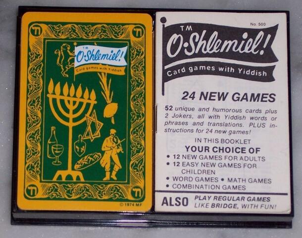 "Card games with Yiddish". This game comes with a double deck of standard cards with several extras: In the lower left, a letter A-Z; upper right, a number 1-52; and in the center, a Yiddish word or phrase, with its English translation. There are also 2 jokers with no letter or number but including Yiddish phrases. The decks are designed to play any normal...