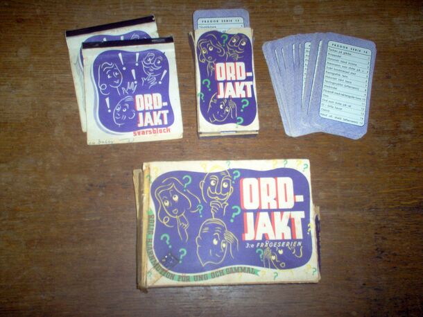 Ordjakt is a word-finding game. Each turn a letter is selected by pulling one of the cards at random and looking at the reverse side. Then you select a suit and find enough cards from that suit (all alike) so that each player gets one. On each card there are 15 categories. The players' task is to find one word that starts with the selected letter for each...