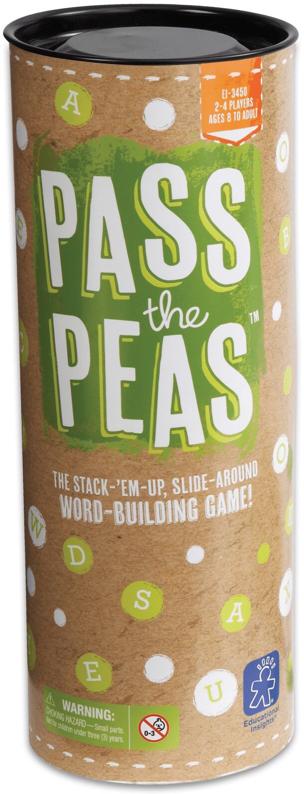In turn, each player picks a pod and 10 letter peas and tries to build a word. Players then pass pods to the left. Each player may then use their remaining peas to build a word on top of the word on the new pod they have just received. When the pea pods have made a full round, players count up the number of their colored peas still showing in all of the...