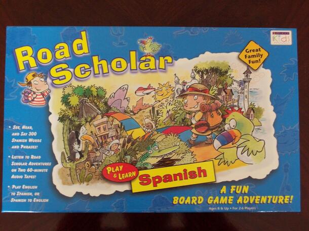 A roll & move game to teach Spanish. Ages 8 and up. From the back of the game box: Pack up your knowledge, memory, and luck and get ready to roll on a Road Scholar Spanish journey. From the START at the airport to the END at the Ancient Ruins, you'll have great fun learning an amazing amount of Spanish as you navigate the perilous twists and turns of the...