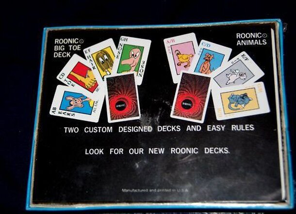 This is a children's word game that licenses the popular TV show of the early 1050's, "The Rootie Kazootie Club". The deck has 6 Key Cards, each of which has two words (e.g. Wagon, Duck). There are 30 letter cards with a letter and an illustrating picture and sentence (e.g. "O o Rootie watches a night Owl"); the 30th card, "Magic Kazootie" is a wild card...