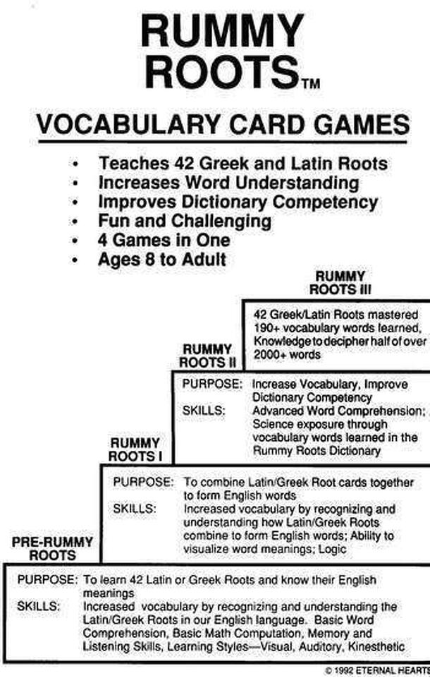 Rummy Roots is an educational rummy variant where players create melds by matching words with their Greek and Latin roots. It contains rules for four different game variants using the set of cards: 1. Pre-Rummy Roots: This is essentially a "Go Fish" game, where the roots are paired with their English equivalents. Whichever card the player has he/she needs...