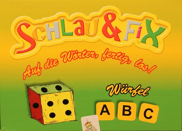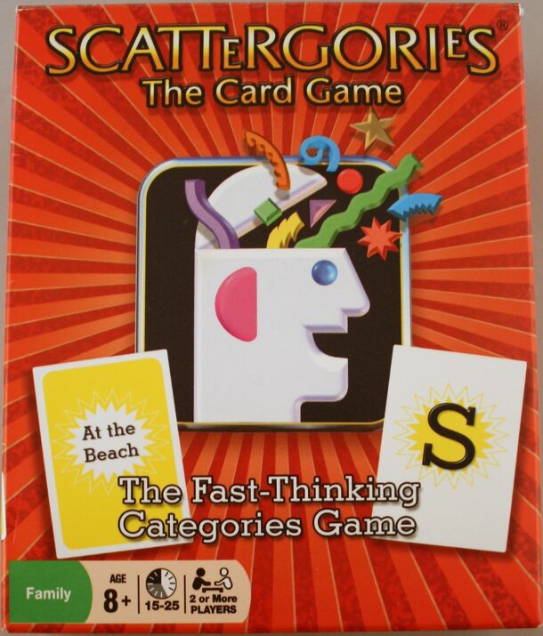 This action/dexterity game has a deck of 33 Category Cards and 55 Letter Cards. At the start of a round, twelve letter cards (in two colors: blue and red) are revealed, along with one category card. The first person to think of a concept that matches the category and slaps a letter card that matches the starting letter of the concept, gets that letter card...