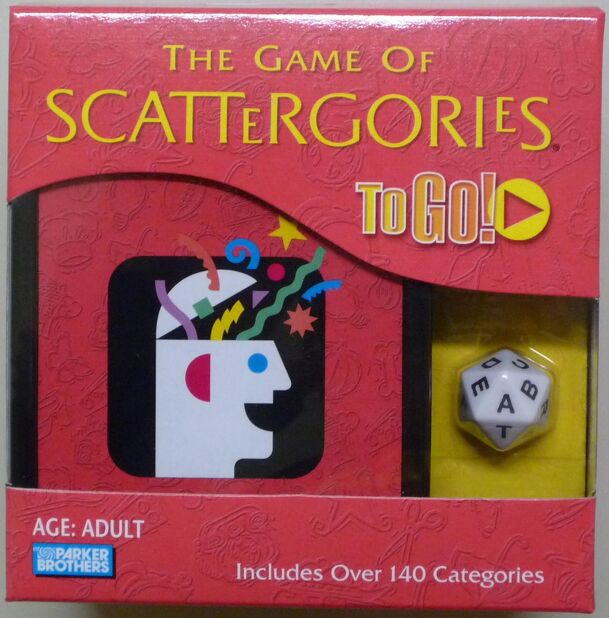 A travel version of Scattergories. Scattergories To Go is a portable party game where the players think of and write a list of words that start with the same letter to match a list of categories. The letter is determined by the roll of a die for each round. Points are scored by having answers that no other player has. Each game is played over three rounds....