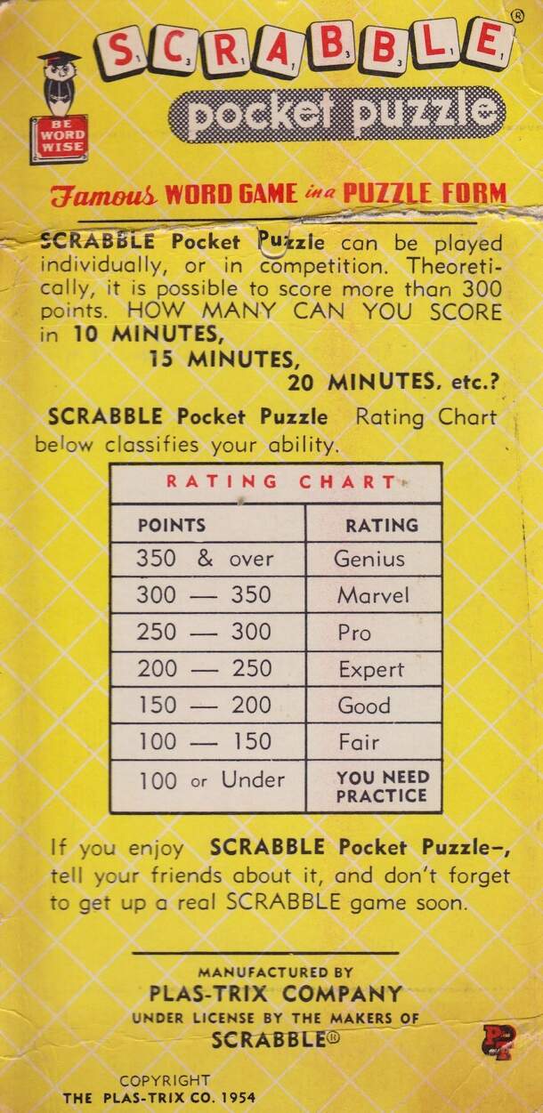 This is a a version of Scrabble that all of the people at a party can play. Each players has a sheet that matches the Scrabble board. The dealer deals out 7 cards with letters and each player plays a word using those letters on his personal board, as if playing Scrabble. Each turn 7 new letters are dealt out. The game continues until the deck (which...