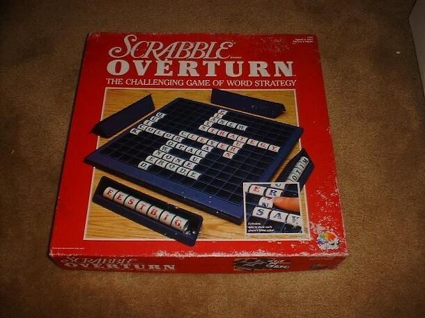 Fundamentally, Scrabble Overturn is a scoring variant on Scrabble (q.v.) The board is a simple grid, into which one places "letter cylinders" which depict a given letter in four colors. If a player employs existing cylinders in making a word, those cylinders are rotated to show the active player's color. Words are scored as played if they score a minimum...