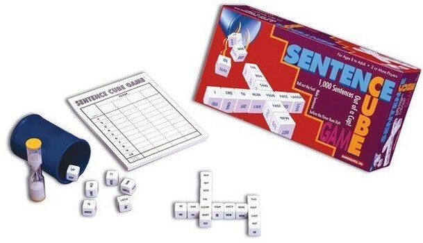 From the publisher's website: Sentence Says Dice Edition is hilarious fun for the entire family to play at home or on the road! Draw an action card and read the sentence instruction. Now roll the letter dice to see what letters you will get to create your sentence. Hurry, the timer's running out! What will your sentence say? For the letters: F, L, S, I and...