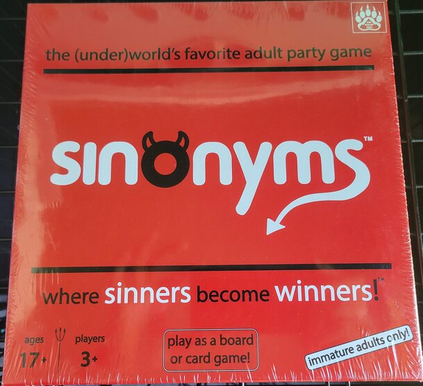 The (under)world's favorite adult party game. Where sinners become winners! player/team rolls the die and lands on 1 of 3 different footprints, black all players/teams call out SINONYMS in direction dictated by card. Devil's Dual footprint, team who rolled picks another team to duel. Red, follow directions on the space. there are black and red word subject...