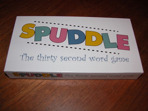 The thirty second word game. Spuddle involves an unusual blend of quick thinking, cunning, table banging fun. Everyone plays at once, there are no individual turns. Each round begins with the 7 lettered dice being rolled. The timer is turned and players have just thirty seconds to make a unique word form the letters shown. Then it's table banging time...