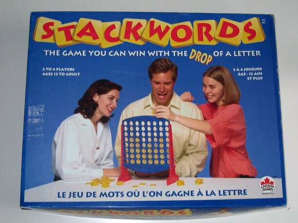 Consists of an 8x8 upright grid into which letter tiles may be dropped at the top of each column. Each column fills from the bottom up. The two players each face a different side of the grid, so what is a legal left-to-right word for one isn't for the other. Only the vertical (top-to-bottom) words are in common. The players score by making words...