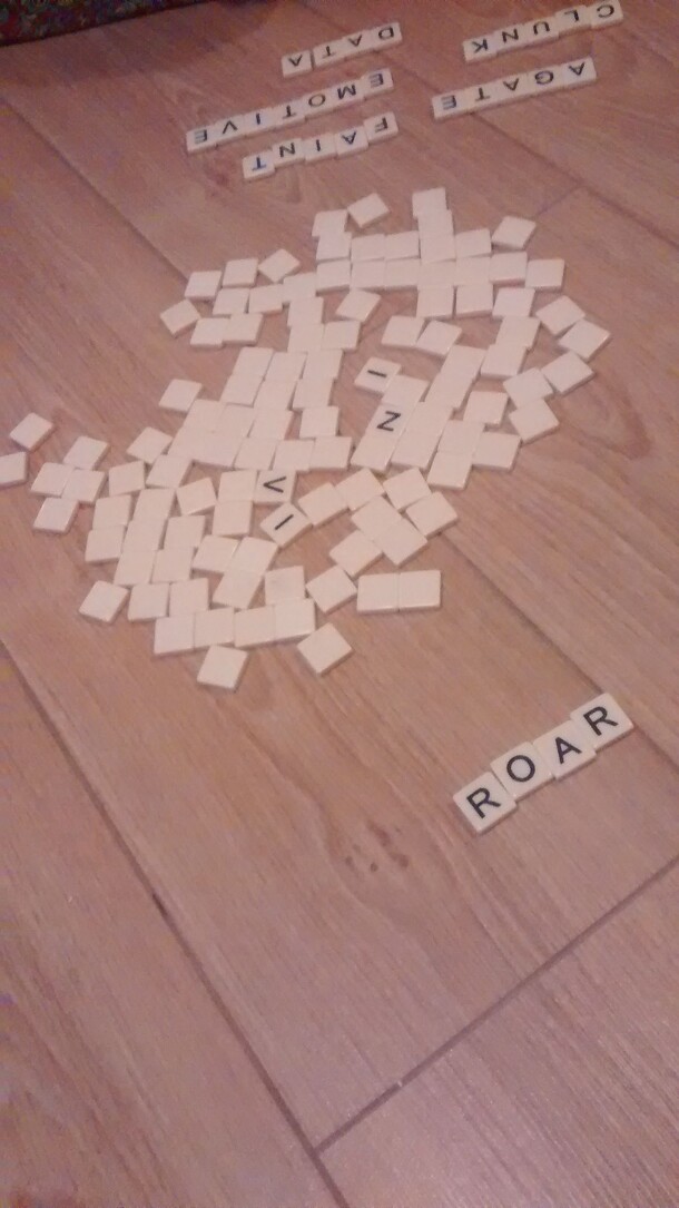 A word game played with a set of lettered tiles. The basic idea common to all versions is that a common pool of facedown tiles are turned faceup one by one and players simultaneously compete to form words using these tiles (for example by calling 'APE' if the letters 'A', P' and 'E' were available in the pool). Points are scored for forming these words...