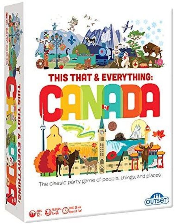 This That & Everything: Canada is all "aboot" famous landmarks, iconic people, cultural influences and more. Players race to describe people, places and things related to Canada for their teammates to guess - in 30 seconds or less! The game includes 100 double-sided cards with six subjects per card, a score pad, pencil, and 30-second sand timer....