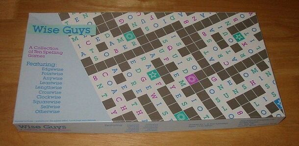 Wise Guys is a collection of 10 spelling games that utilize the same board and letter tiles. The letters are divided into three groups: Blue tiles (vowels-A,E,I,O), Green tiles (common consonants & "U"), and Pink tiles (less common consonants & wild "infinity" tiles). Certain spaces on the board have a color & symbol that might affect scoring or word...