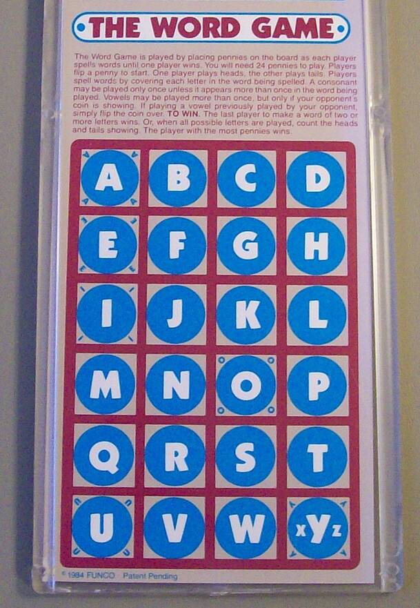 The Word Game is played by placing pennies on the board as each player spells words until one player wins. 24 pennies are needed to play. One player plays heads, the other plays tails. Players flip a penny to start. Players spell words by covering each letter in the word being spelled. A consonant may only be played once unless it appears more than once in...