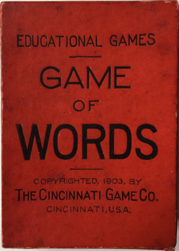 Word Game is one of a series of educational card games published at the turn of the 20th Century by Cincinnati Game Co. The game consists of a deck of 111 half-size cards, each bearing a single letter, with the number of each letter varying from 1 (j, k, q, v, x, y, z) to 12 (e). The rules booklet describes a Primary Exercise for first-year students, three...