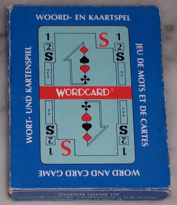 A word card game that is similar to Rummy 500, with many options to its play. The deck has 8 suits of cards 1-K, each one also having a letter and point value; there are also 4 joker/wild cards. The rules (and facecard names) are in French, English, Dutch and German. In a turn, a player: 1. Draws the top of the draw pile, or any card of the discard pile...