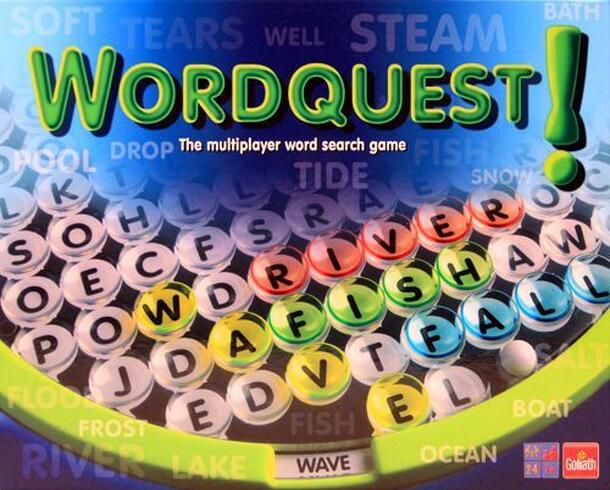 In Wordquest, players are confronted with a tableau of letters. Each tableau has a list of words that can be found in those letters, whether left to right, right to left, top to bottom, bottom to top, or diagonally. This game is basically a multi-player word search. When you locate the word, you mark it with your color tiles. If an opponent finds a word...